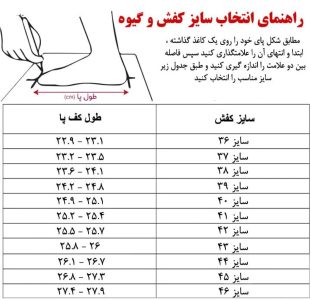 پای خود را روی یک کاغذ قرار دهید و به صورت عمود و دقیق پاشنه و نوک شصت را علامت گذاری کنید. طول پای خود را اندازه بگیرد، از پاشنه تا نوک انگشت شصت را با خط کش اندازه بگیرید. حال عدد به دست آمده را در جدول زیر قرار دهید و سایز خود را پیدا کنید. در کشور ما سایز اروپایی برای تعیین سایز کفش ها استفاده می شود . ملاک ما برای پیدا کردن سایز کفش، سایز اروپایی می باشد.